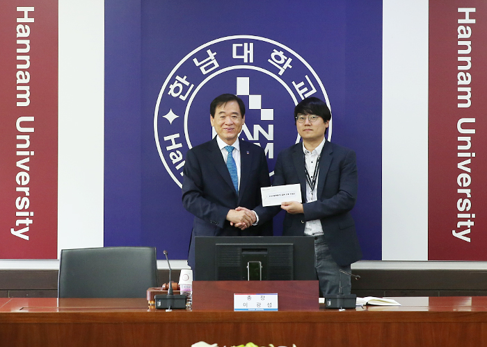 이광섭 한남대 총장은 16일 오후2시 교무위원회에 앞서 본교의 ‘4차 산업혁명 혁신선도대학’ 선정에 공헌한 공로로 소요환 단장과 송완수 미래전략팀 국책사업기획담당 직원에게 포상금을 전달했다.