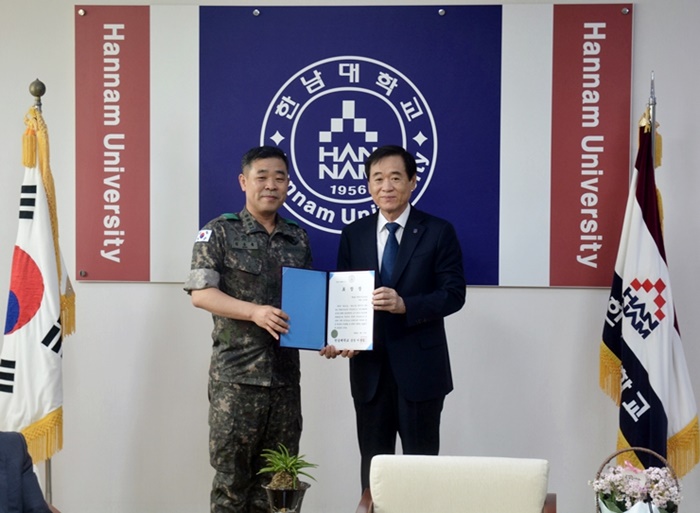 한남대학교 제146 학생군사교육단 단장 이임 및 취임 신고식이 6월 17일 ‘코로나19’로 인해 총장실에서 약식으로 진행되었다.